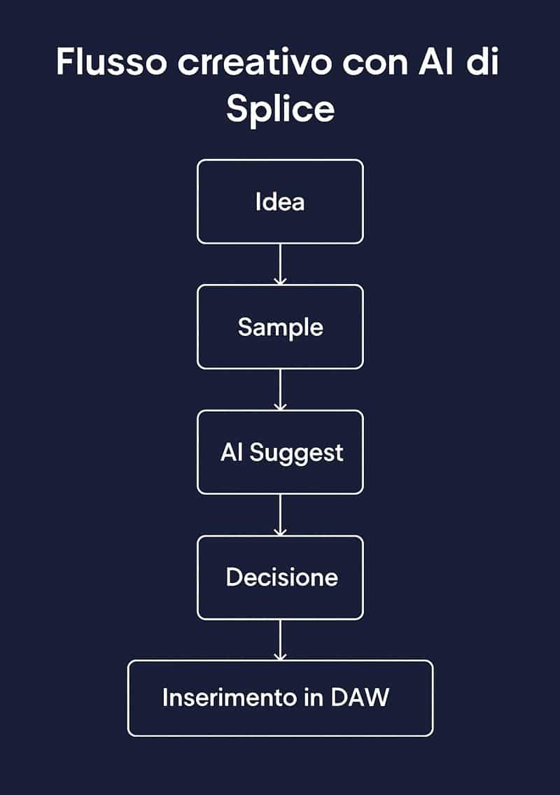 Questo grafico illustra il percorso creativo guidato dall’AI di Splice, aiutando il lettore a comprendere come l’intelligenza artificiale supporta la scelta dei sample.