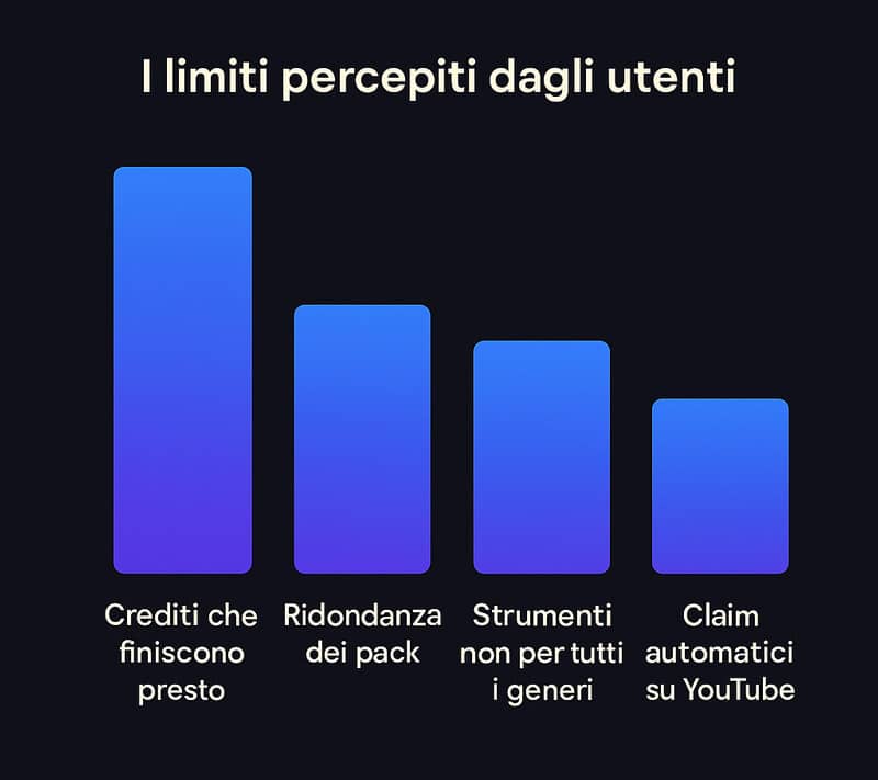 Nonostante il sentiment generalmente positivo, ci sono alcune critiche ricorrenti che emergono in modo chiaro nelle community. La prima riguarda il costo percepito, soprattutto per i producer alle prime armi o per chi crea musica a bassa frequenza. Alcuni utenti riferiscono che i crediti “finiscono troppo in fretta”, specie se si usano molti one-shot o se si esplorano generi ad alto turnover sonoro.