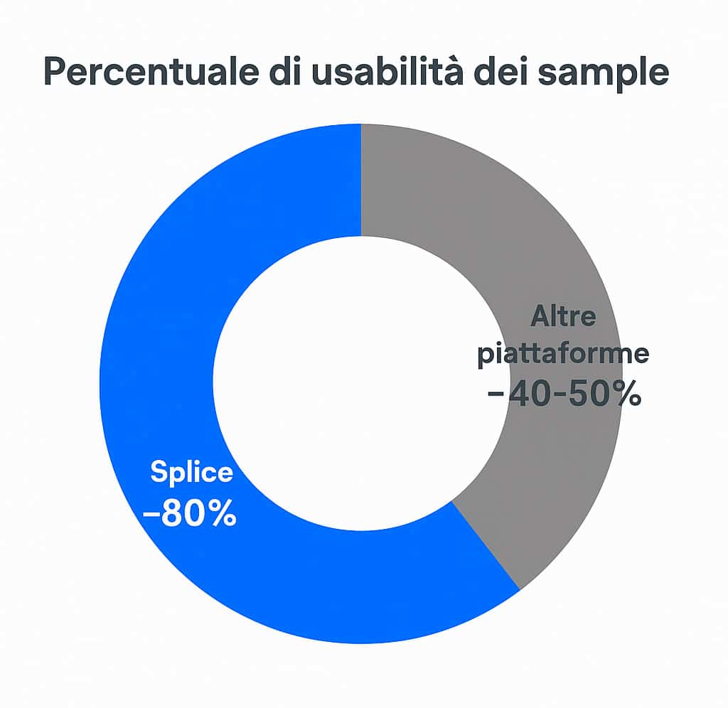Questo grafico mostra, in modo semplice e immediato, la percezione diffusa tra i producer sulla reale usabilità dei sample provenienti da Splice rispetto ad altre piattaforme.