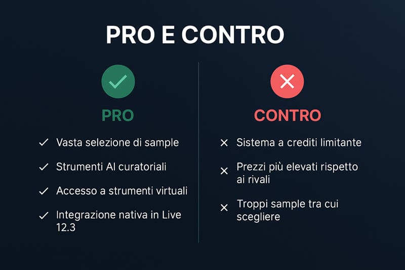 | Sounds+ | 100 | $12.99 / mese | Libreria sample completa, ricerca AI, Similar Sounds, download royalty-free | Producer che usano molti sample e vogliono qualità costante |