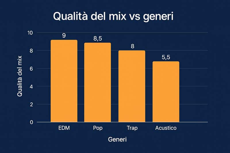 I generi moderni come pop, EDM, trap e cinematic erano quelli meglio interpretati. I limiti emergevano nei generi complessi o acustici, dove il modello tendeva a semplificare la struttura.