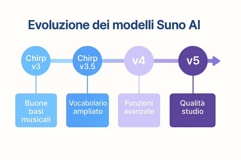 Evoluzione dei modelli Suno AI (v3 → v5)