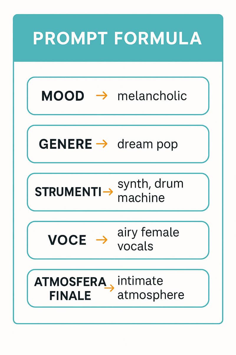 Mood + Genere + Strumenti + Voce + Dettaglio finale emotivo.