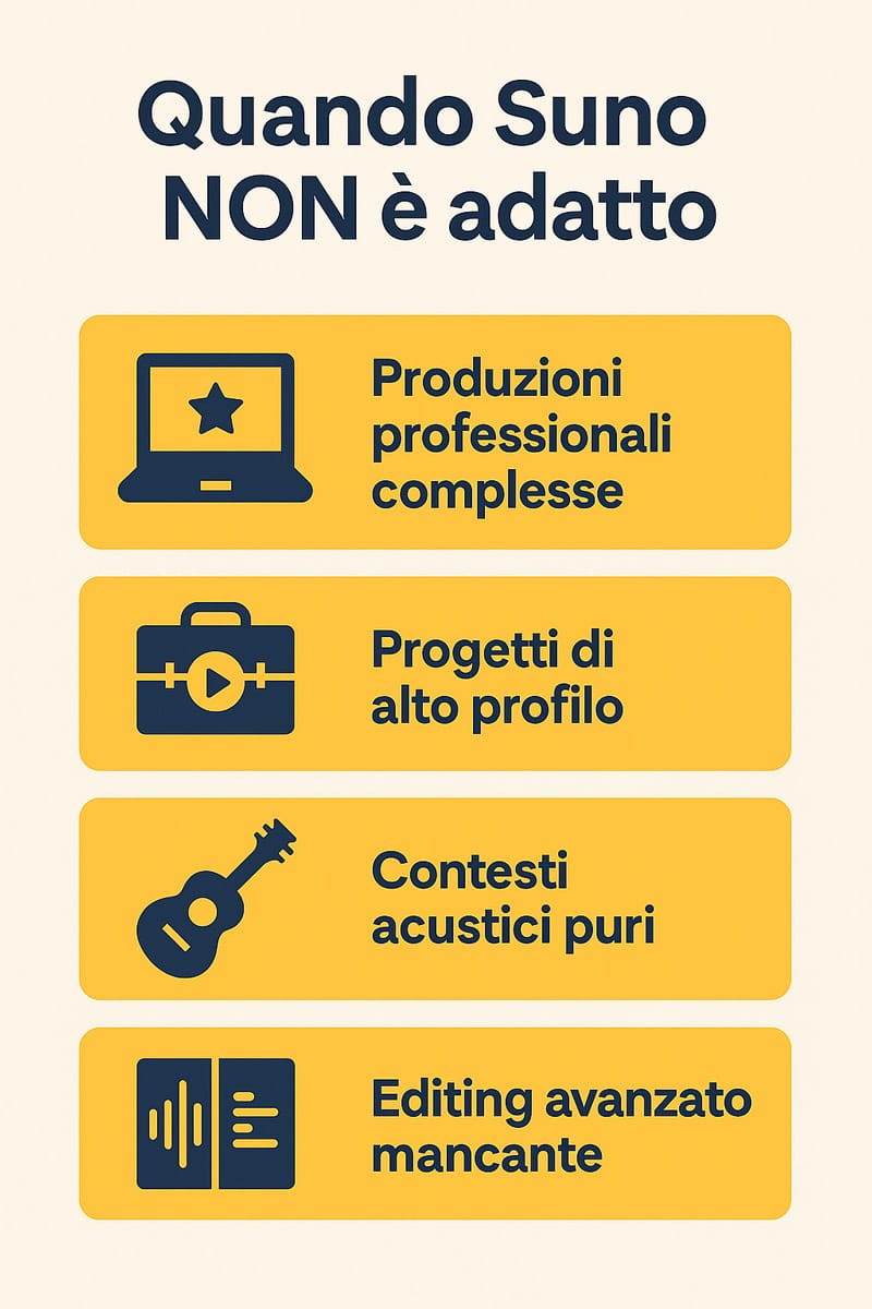 Conoscerle aiuta a capire quando Suno è davvero la soluzione migliore e quando invece un altro tool può offrire un risultato più adatto al tipo di progetto.