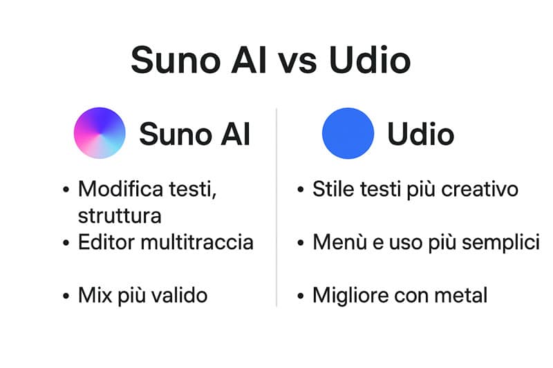Udio offre una voce più pulita e “pop”, mentre Suno è più flessibile nei generi e dispone di Suno Studio per un editing più preciso. Entrambi generano canzoni complete con voce.